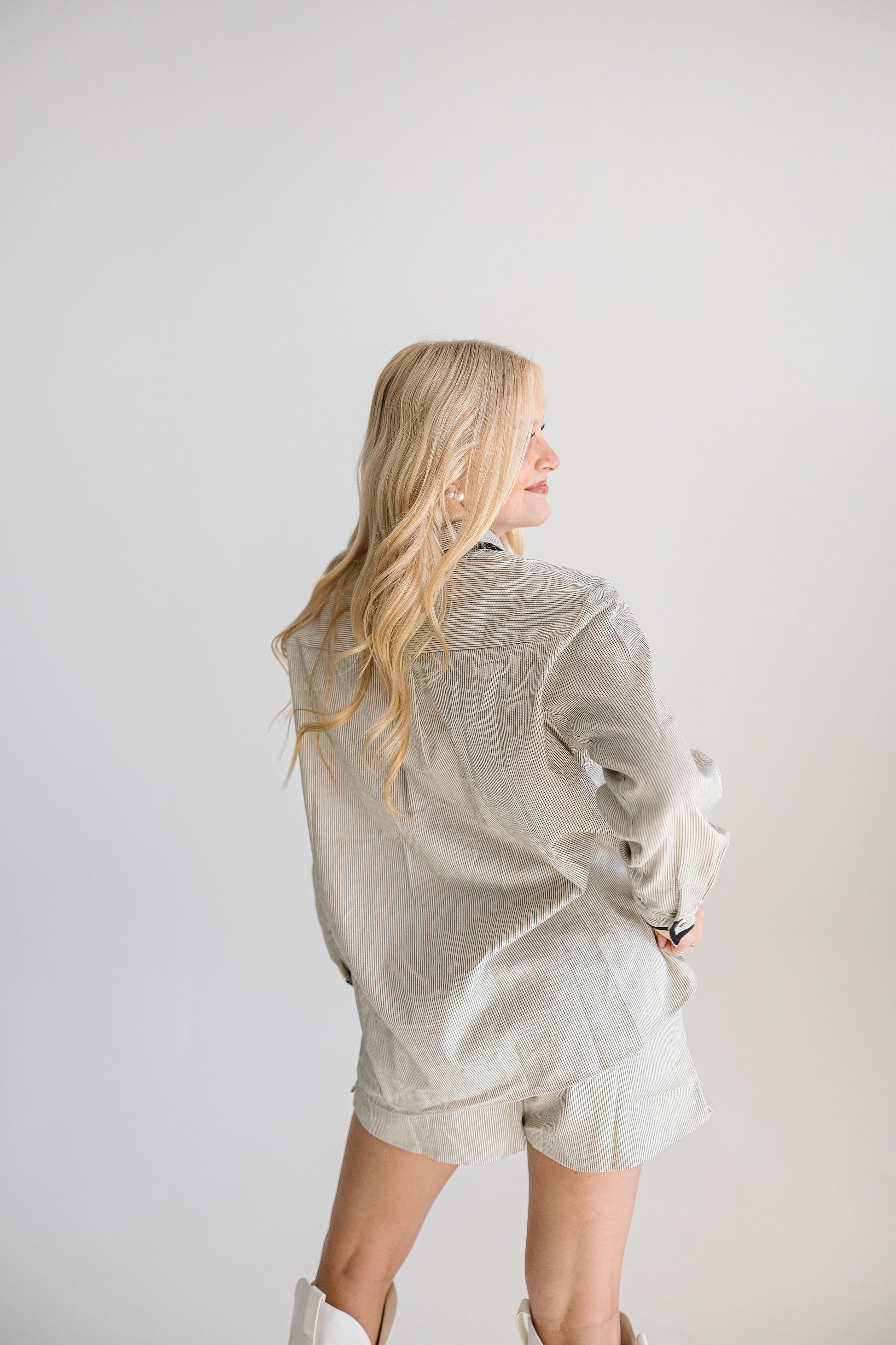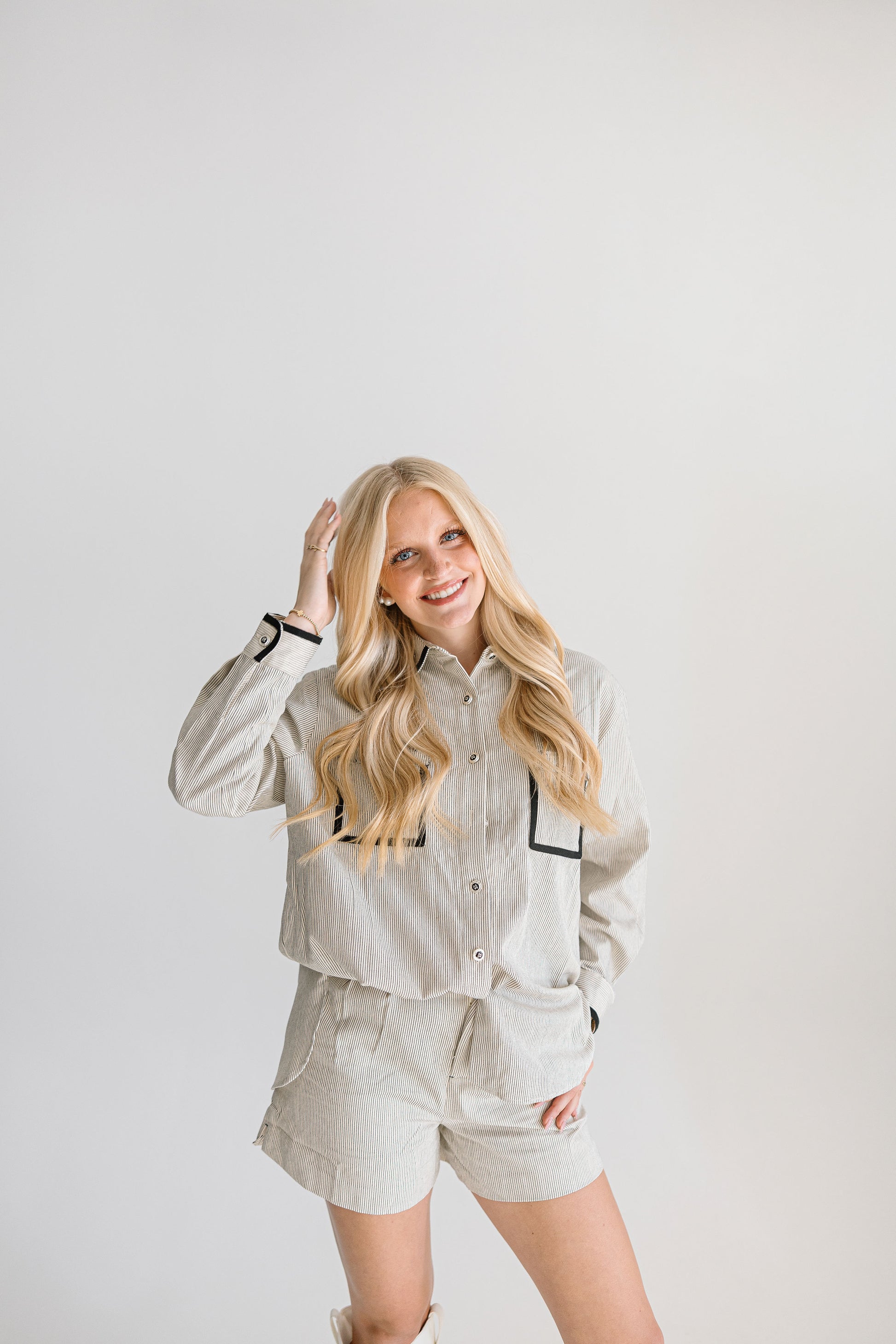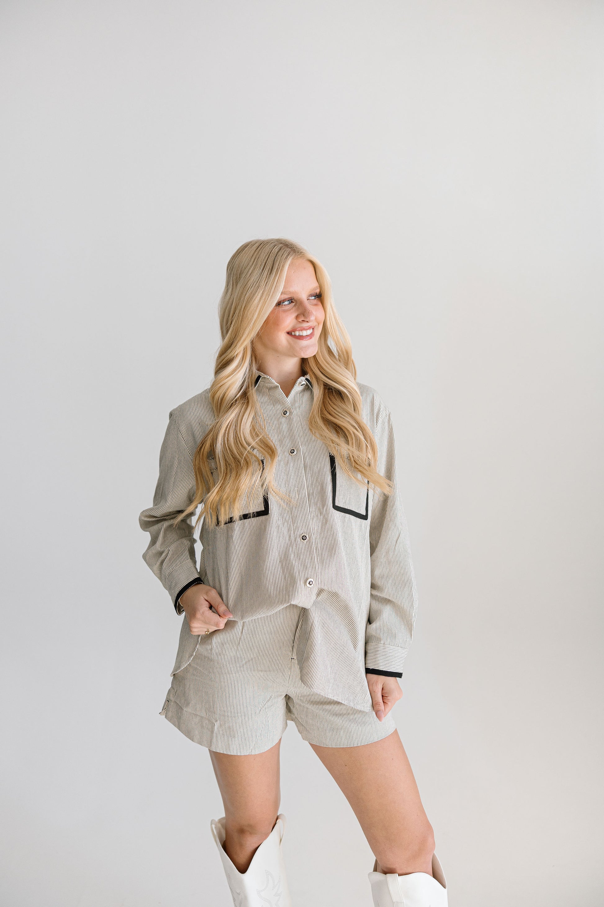 The Briar Set brings effortless sophistication to your seasonal wardrobe. This coordinated duo pairs a crisp button-down top featuring eye-catching wrist detailing with tailored shorts that hit just right. Whether you're gathering with loved ones for Thanksgiving, stepping out for a cozy fall evening, or cheering on game day, this set delivers polished style that works for any occasion. Comfortable enough for all-day wear, yet refined enough to feel special.