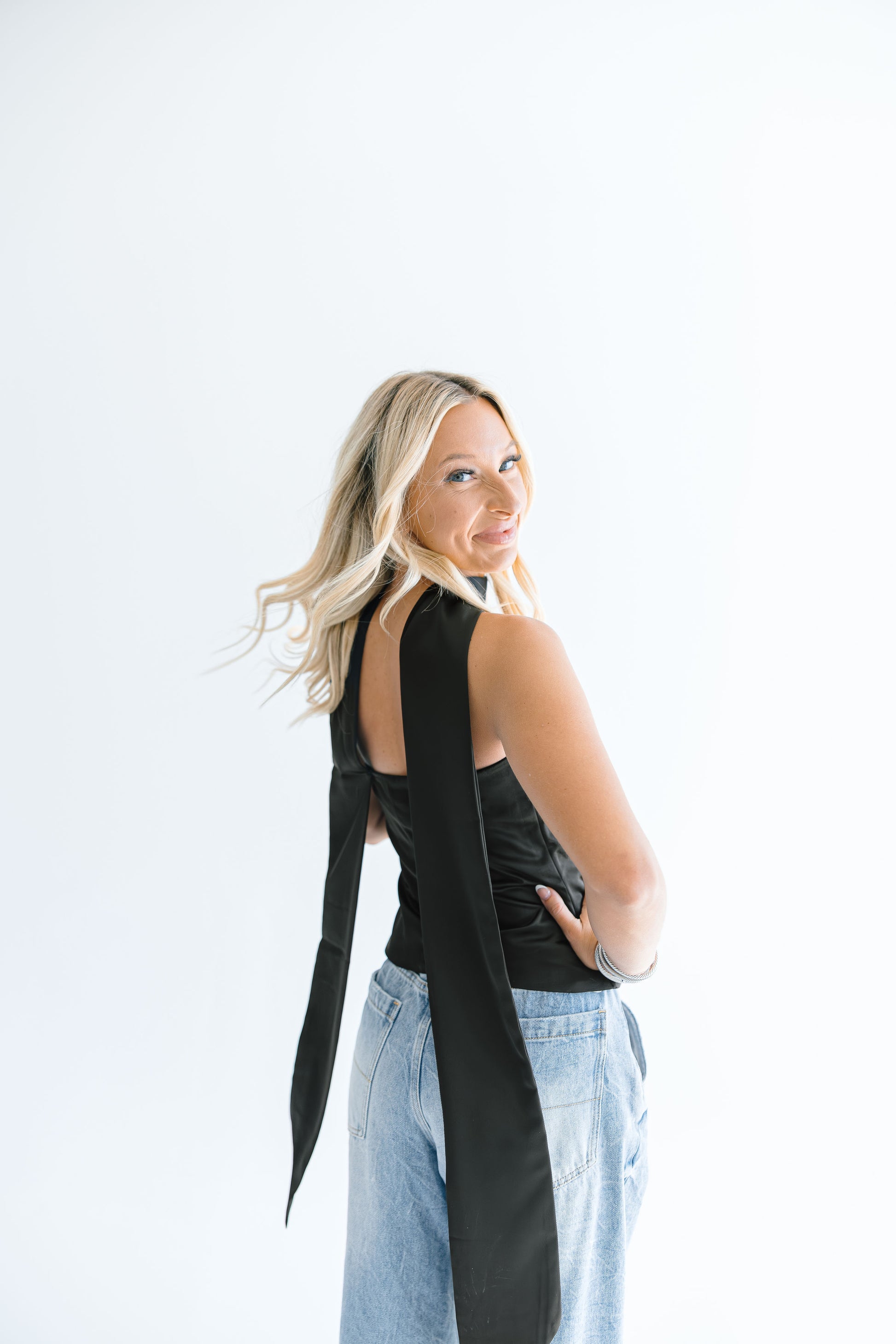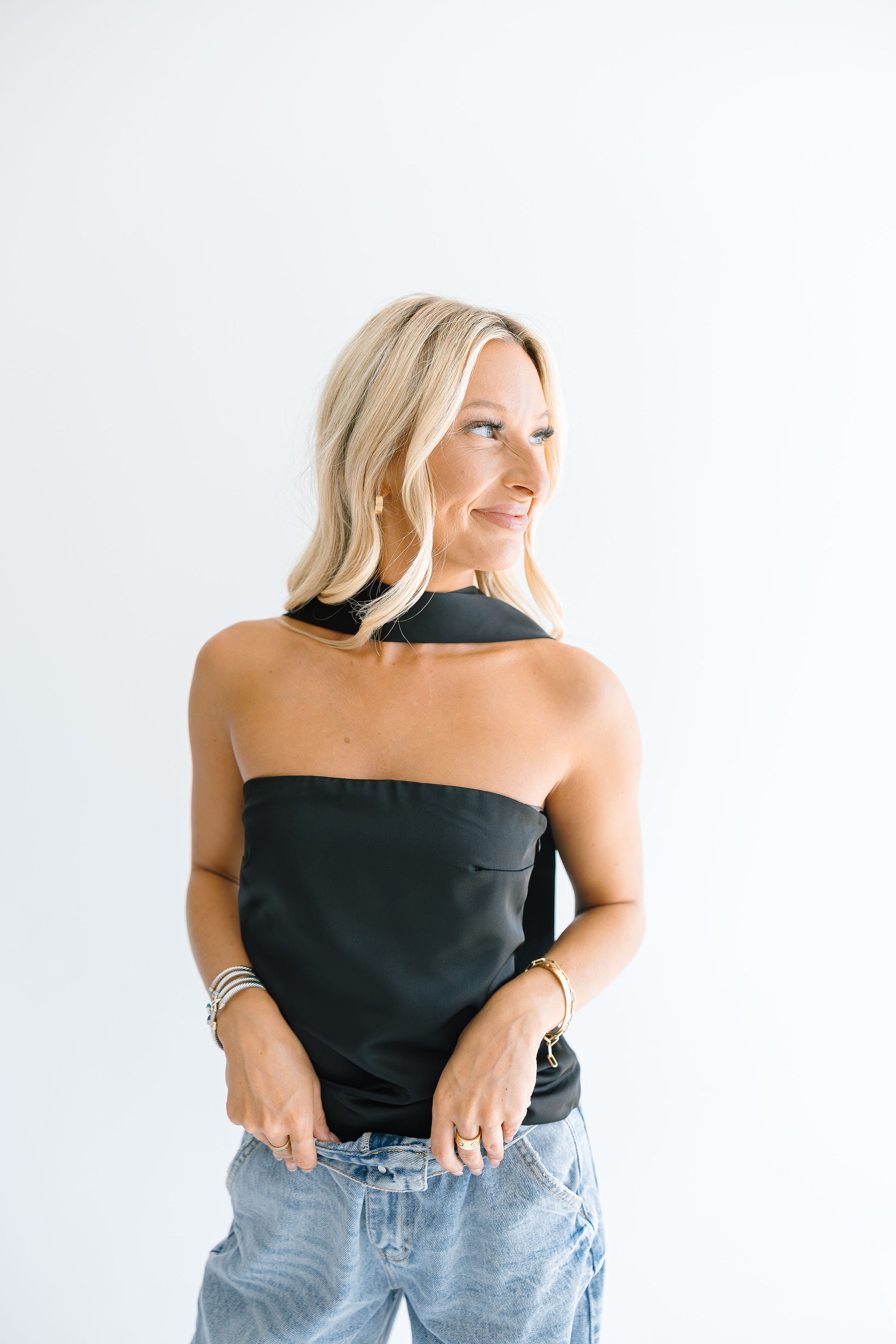 Introducing The Crosby Top - a versatile and chic addition to your wardrobe. This bandeau satin top is designed with an attached scarf that can be styled in multiple ways. Elevate any outfit with this must-have piece that adds a touch of sophistication.