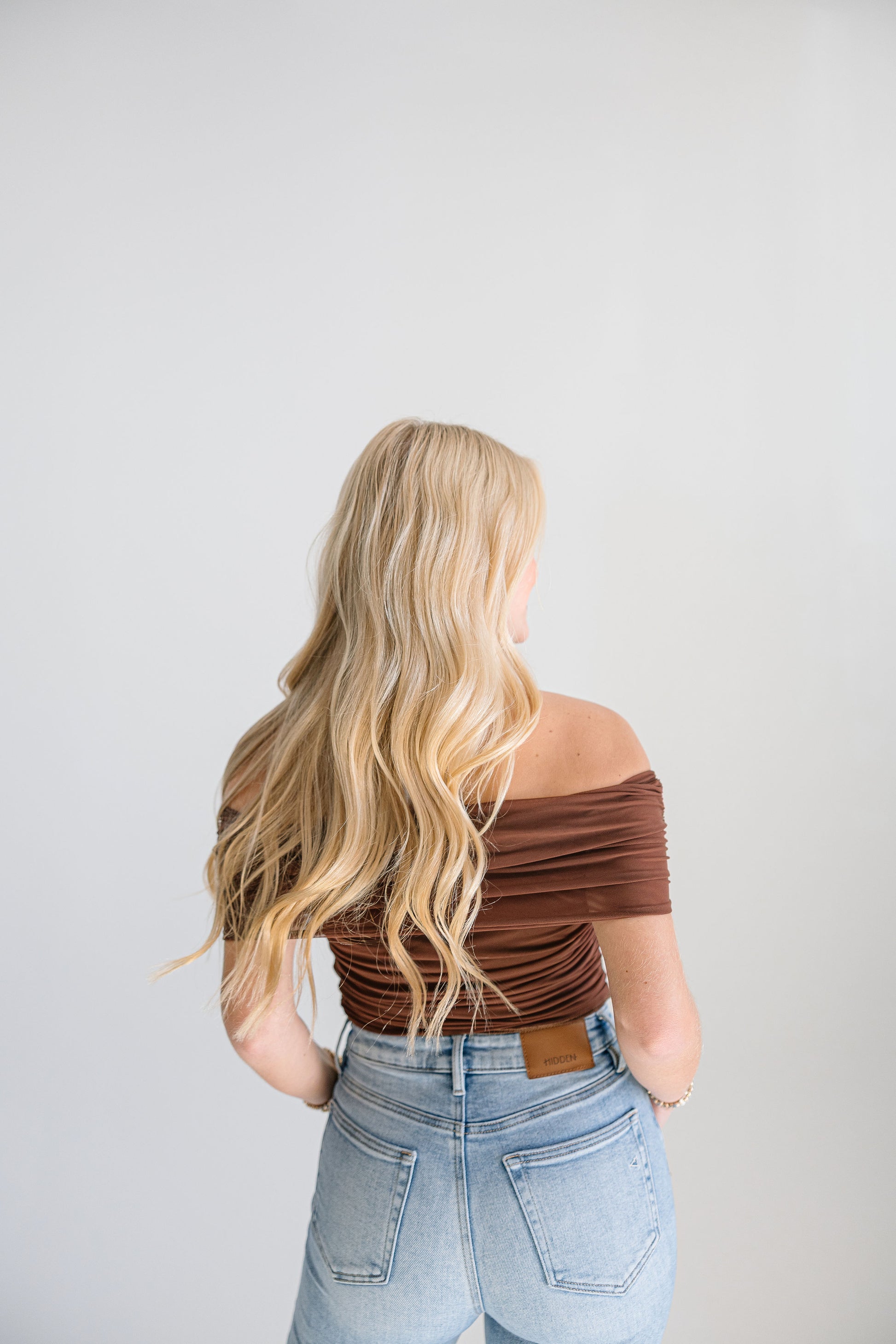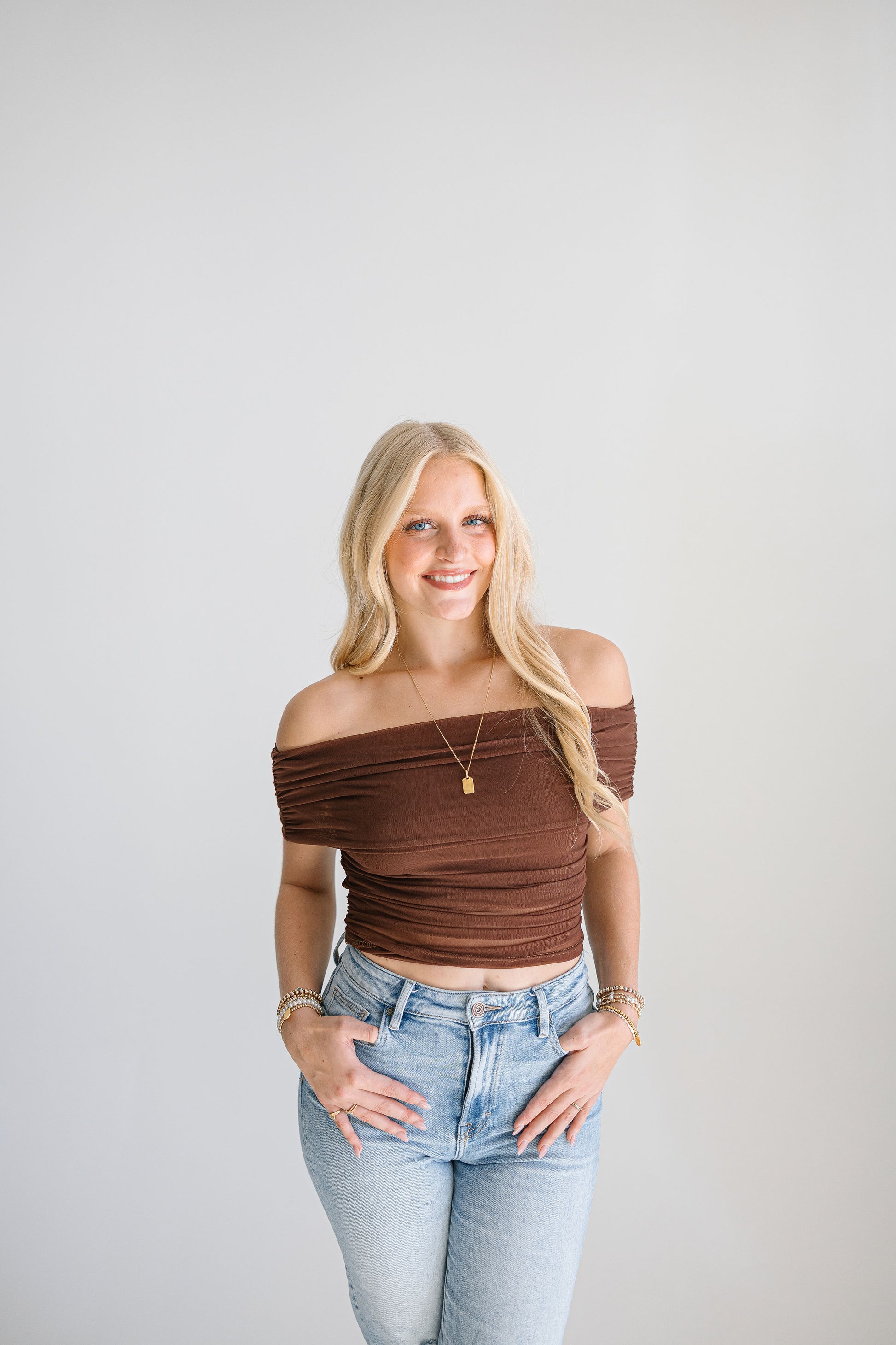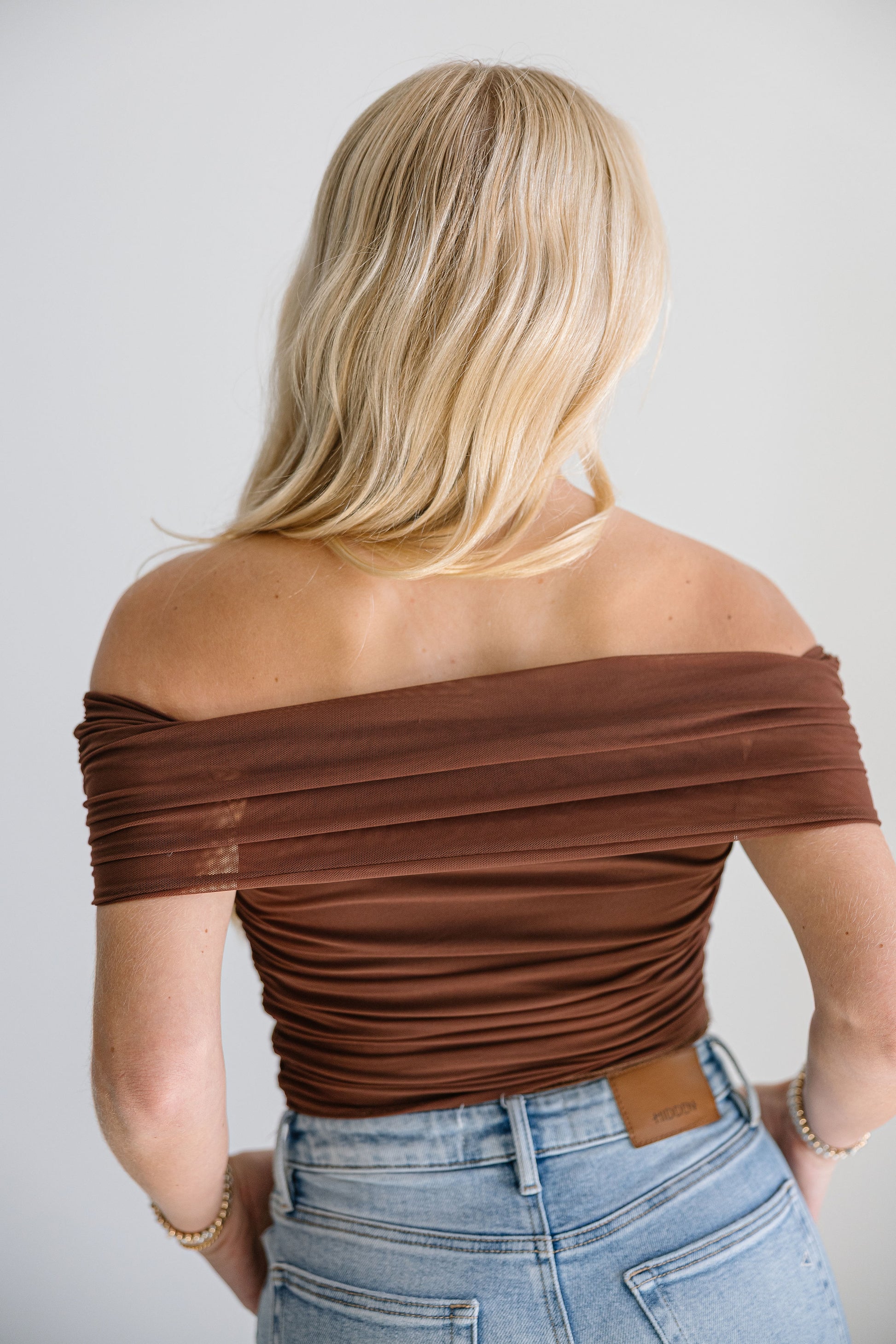 The Emmy Top is your go-to piece for effortless fall style. This versatile off-the-shoulder mesh top in rich chocolate brown adapts to however you want to wear it—dress it up for a night out or keep it casual for everyday wear. The flattering neckline and breathable mesh fabric make it comfortable enough to reach for again and again. Whether you're layering it or wearing it solo, this top deserves a permanent spot in your seasonal rotation.